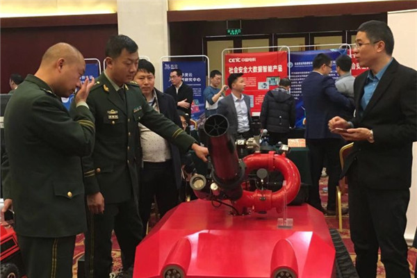 | Government officials show interests on a fire-fighting robot at the meeting. [Photo/zgc.gov.cn] |