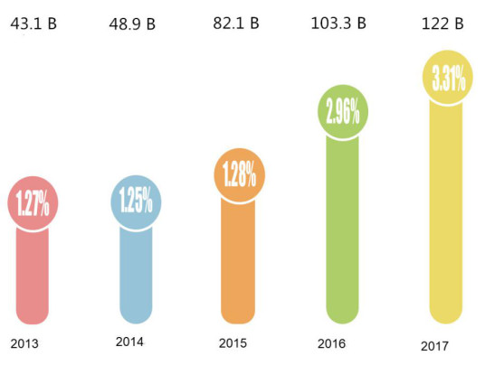 In 2017, the total research and development expenses of Zhongguancun listed companies was RMB 122 billion, up 18% year-on-year; the average R&D intensity was 3.31%, much higher than that of A-share companies.