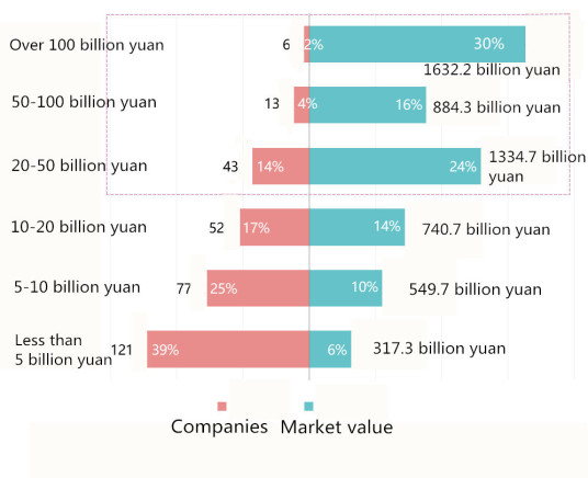 The market value distribution continued to have a "long-tail effect". Twenty percent of companies with the highest market capitalization accounted for 70% of the total market value.