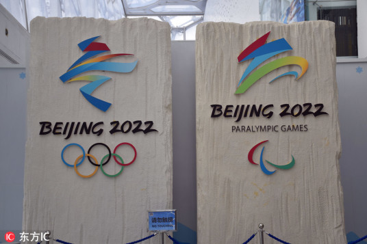 View of the official emblems of the Olympic and Paralympic Winter Games Beijing 2022 on display at the Beijing National Aquatics Center, also known as the Water Cube, in Beijing, China, on Aug 7, 2018. [Photo/IC] |