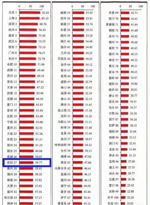 Guiyang ranks 27th nationwide in its innovation capability index and the top 100 cities list for national urban innovation capability.