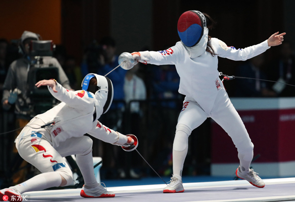 Wuxi fencing athlete Xu Chengzi competes with South Korean athlete Choi In-jung in the final of the women's epee team match at the Jakarta - Palembang Asian Games at the Jakarta Convention Center in Jakarta, Indonesia on Aug 24. [Photo/IC] |