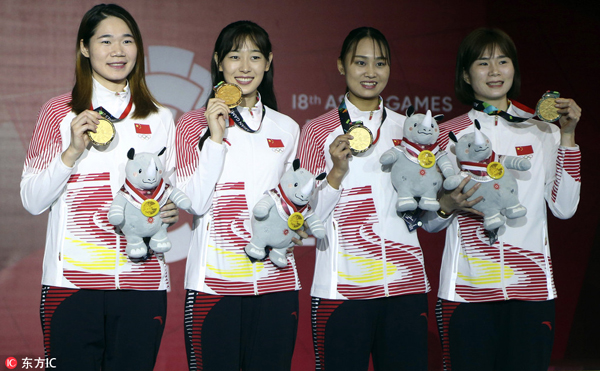 From left, Chinese team members Zhu Mingye, Sun Yiwen, Xu Chengzi, and Lin Sheng pose with their gold medals for women's epee team fencing at the 18th Asian Games in Jakarta, Indonesia, Aug 24.[Photo/IC] |