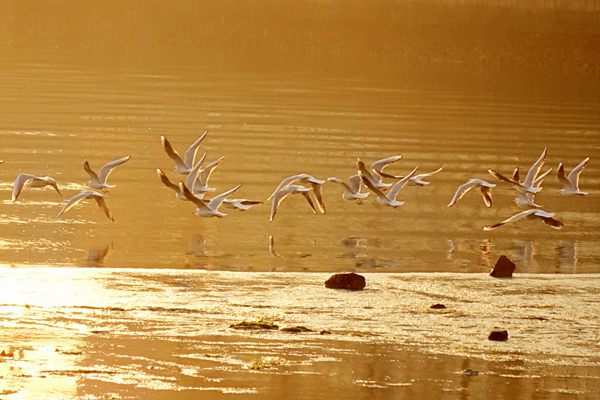 Tangdao Bay in Qingdao West Coast New Area (Qingdao WCNA) has become a breathtaking spectacle as it bathes in the radiant glow of the rising sun. The scene is dominated by the captivating presence of black-headed gulls, adding a touch of vibrancy to the winter seascape.