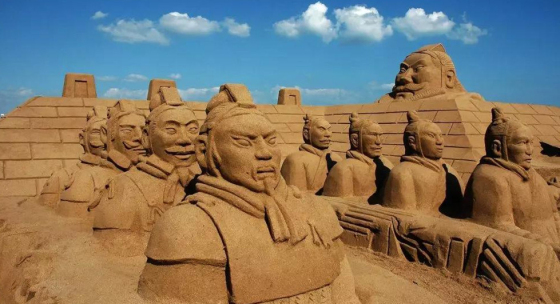 A set of sand sculptures of ancient soldiers at the Haiyang International Sand Sculpture Art Park [Photo/WeChat account: xianjingyantaishe]