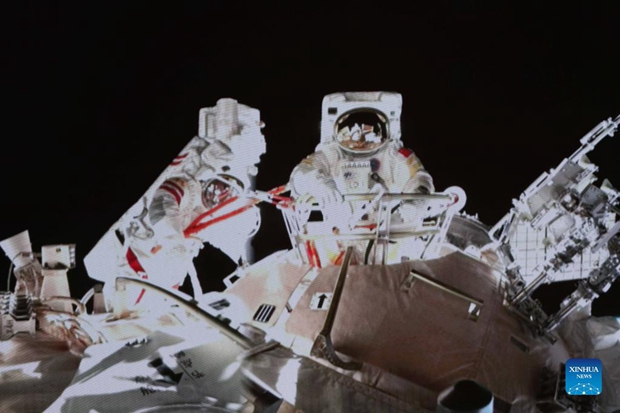 Screen image taken at Beijing Aerospace Control Center on Nov 8, 2021 shows Chinese taikonaut Wang Yaping (R) completing extravehicular activities (EVAs). [Photo by Xinhua] |