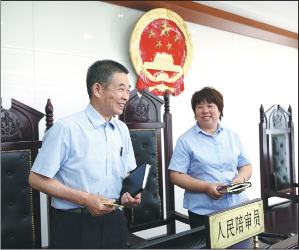 Lu Youcai (left) and Li Wenyun, both people's assessors at Beijing Haidian District People's Court, participate in a criminal case hearing on May 29.Zou Hong / China Daily |