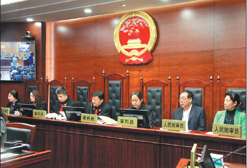 Diao Quangui (second from right) hears an air pollution case with three other people's assessors and three judges at Beijing No 4 Intermediate People's Court on May 8.Provided To China Daily |