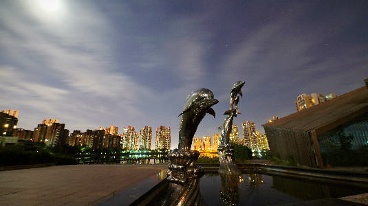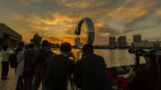 At dusk, the sunset glow tints the sky red. Residents gather at Yinhe Square, watch the "rising moon over the water" sculpture in the sunset, and photograph the wonderful moment. Creator/Source: Hexi District Cyberspace Administration
