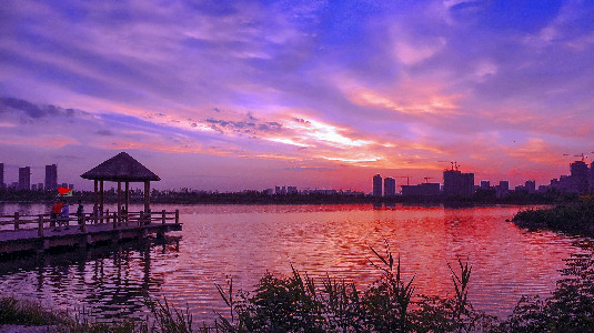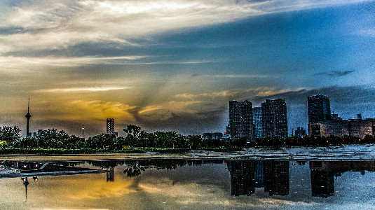 夕阳隐在云后,透过叠云分射出橙黄的光芒,另一边的天空渐暗由湛蓝转为深蓝,东西两边的天空如同冰火二重天,地面上水映天景,甚为壮丽多彩。 作者/来源:河西区委网信办