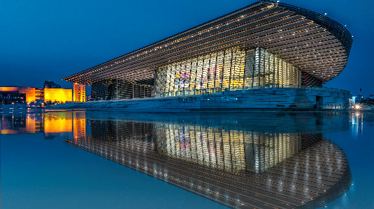 Tianjin Culture Center at night. Creator/Source: Hexi District Cyberspace Administration