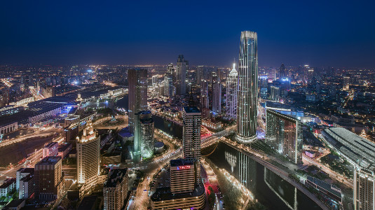 Jinwan Plaza features multi-style modern architecture, and reflects the fusion of Chinese culture with western cultures. Creator/Source: Hexi District Cyberspace Administration