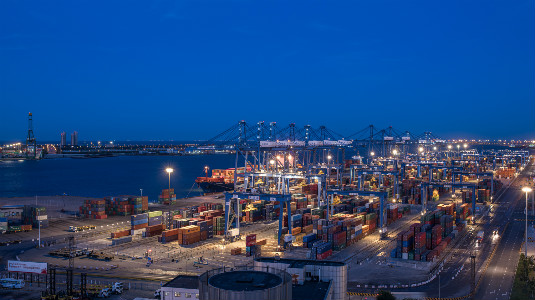 Tianjin Port becomes quiet after a busy day. A few containers wait for transport. Creator/Source: Hexi District Cyberspace Administration
