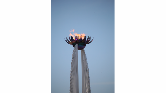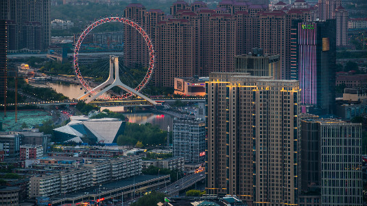 The Tianjin Eye is a 120-meter tall giant ferris wheel built above the Yongle Bridge, over the Hai River in Tianjin. It looks like an eye on a bridge and is one of Tianjin's famous landmarks. Every evening when the lights come on, the ferris wheel glows like a diamond in the sky. Creator/Source: Hexi District Cyberspace Administration