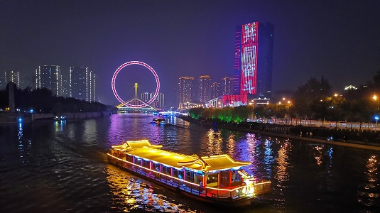 The Tientsin Eye and touring on the Haihe River inject vitality into the night of the port city. Creator/Source: Hongqiao District Cyberspace Administration