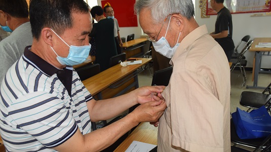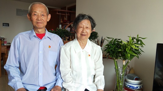 An elderly couple, both veteran Party members, pose for a group photo wearing Party emblems. They put on their shirts and Party emblems to celebrate the 99th anniversary of the founding of the Communist Party of China on July 1. Creator/Source: Li Dongmei