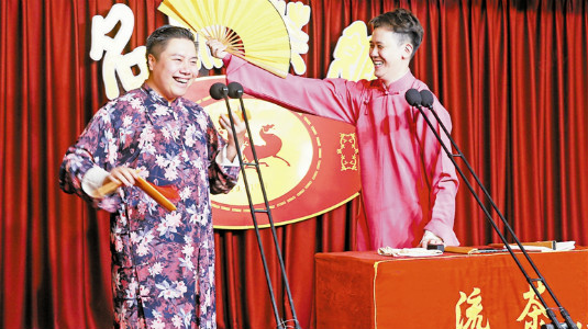Cross-talk actors perform on the stage. Mingliu Teahouse, closed for more than a hundred days, finally reopens for business. Creator/Source: Tonight News Paper
