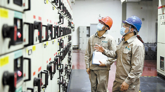 Technicians conduct a safety inspection of the equipment in the low voltage distribution room. State Grid Tianjin Chengxi Power Supply Company completed the power capacity increase for the 5G expansion project of a big data center affiliated to China Telecom Tianjin Branch, providing sustainable and safe power support for 5G infrastructure. Creator/Source: Cao Tong