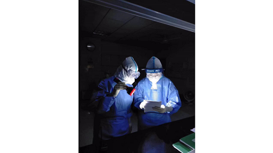 In the early morning of February 26, Wuhan was hit by a sudden heavy rain. Medical members of Tianjin Teda Hospital supporting Wuhan completed the task of blood collection and testing of patients in an timely manner after a power cut caused by heavy rain, with only one set of emergency lighting equipment available for one hour. Creator/Source: Binhai Teda Subdistrict