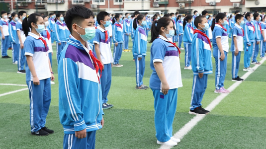 Students carefully listen to a speech made during the flag-raising ceremony on the playground. Creator/Source: Tianjin Nankai District Education Bureau