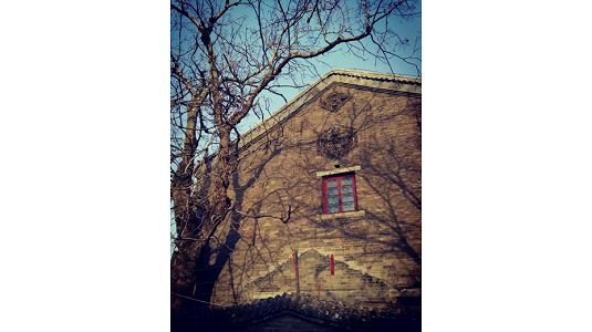 A tree casts its shadow on the wall of an old brick house. Creator/Source: Chen Ying