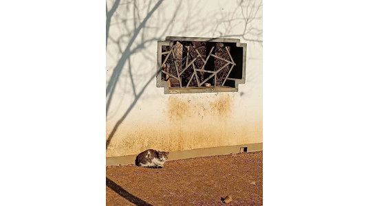 A cat bathing in the sun by the wall dozes off. Creator/Source: Chen Ying