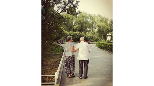 An old couple walk hand in hand in the evening. Creator/Source: Chen Ying