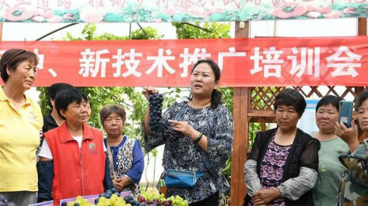 Tian Shufen (C), a professor of Tianjin Agricultural University, introduces new viticultural techniques to fruit farmers at the Jinguo Ecological Park in Meichang town, Wuqing district, Tianjin. The town has focused on developing modern urban agriculture, building a grape planting demonstration base, and spreading new grape varieties and new grape planting technologies to surrounding villages.
