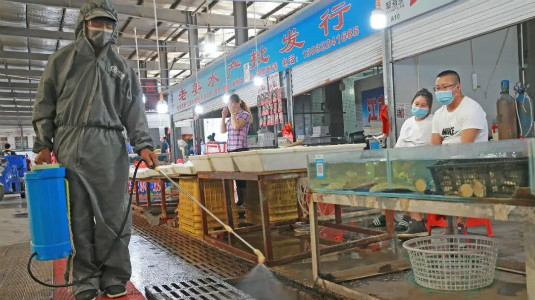 A worker of a wholesale market in Beichen district carefully disinfects the drainage system in the seafood business area. The reemergence of the virus in the capital of Beijing is a reminder to Tianjin market regulatory authorities, who promptly carried out a citywide food safety inspection to ensure the health and safety of the people. Creator/Source: Gao Yinghui
