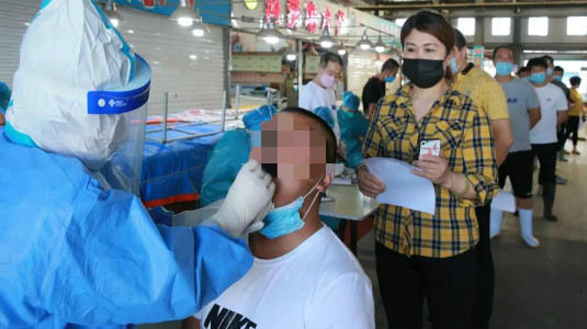 The Beichen District Health Committee organized workers to conduct on-site nucleic acid tests on market operators at a farmers' market. The reemergence of the virus in the capital of Beijing is a reminder to Tianjin market regulatory authorities, who promptly carried out a citywide food safety inspection to ensure the health and safety of the people. Creator/Source: Gao Yinghui