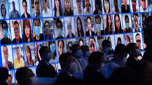 Participants pose for a group photo. The online opening ceremony for media publicity of the fourth World Intelligence Conference (WIC) is held today in the Big Data Command Center of the Tianjin Cyberspace Administration of China, a sign that the WIC’s online publicity campaign continues to heat up. Creator/Source: Ma Cheng