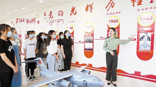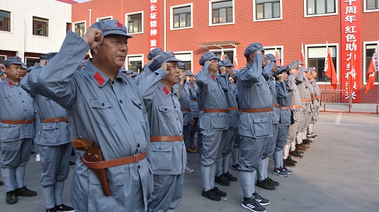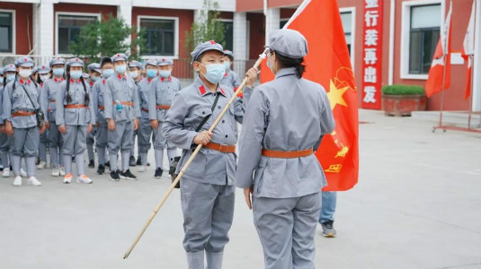 Pupils dressed in Red Army uniforms hand over the flag of the CPC children's regiment. The opening ceremony of "Ideological and Political Classroom and Patriotism Education Base" which was initiated by Hexi Pingshandao Primary School and the Institute of Marxism of Tianjin University to promote ideological integration of universities and primary and secondary schools, is held in Xiqing District.