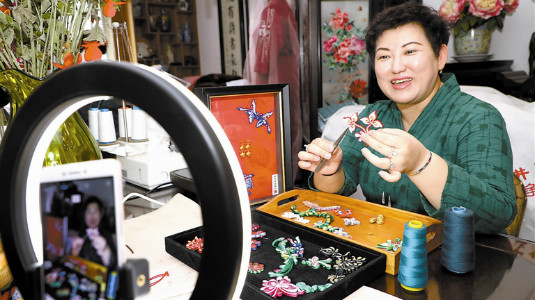 Xing Jin, an inheritor of Tianjin-style Pankou Weaving (used to create ornamental woven fasteners on clothing), explains the steps to an online audience. Creator/Source: Tonight News Paper