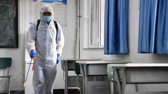 At a middle school in Tianjin, a staffer disinfects the examination room. Creator/Source: Li Ran