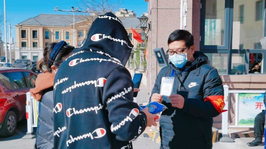 疫情防控期间,下沉社区的党员干部在官邸一号小区协助执勤,居民扫“津门战疫”二维码进入小区。 作者/来源:马靖雅