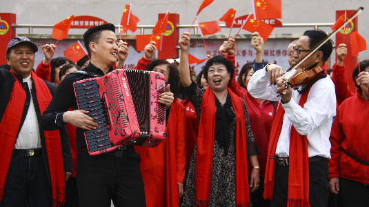 The residents express their love for the Communist Party of China and the great motherland by singing aloud. Creator/Source: Shen Qimin