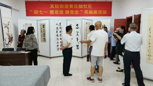 Residents of Huanghuanao community appreciate the paintings and calligraphy works that express the creators' deep feelings for the Party and the country to celebrate the birthday of the 99-year-old Communist Party of China. Creator/Source: Zhang Aibing