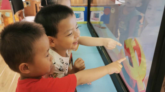 Hedong No 2 Kindergarten carries out a patriotic education activity. During the activity, children are taught to recognize the emblem of the Communist Party of China. Creator/Source: Sun Lijing