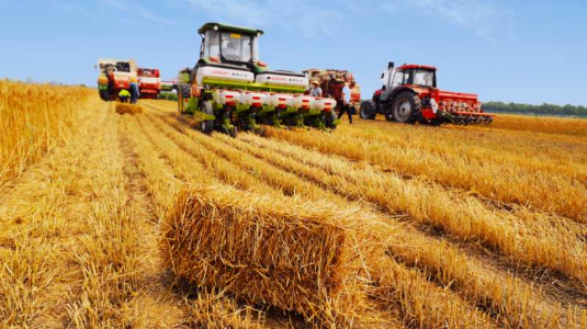 Five combine harvesters drive into the wheat fields of Xiaowangzhuang Town in Binhai New Area, getting to work on Tianjin's summer harvest. Creator/Source: Jinyun WeChat Account