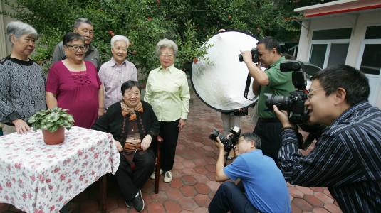 Tianjin CPPCC members' art team take pictures for the aged of Heshou Gerocomium. Creator/Source: Heping District Cyberspace Administration