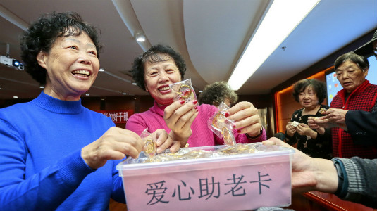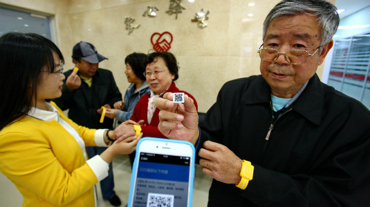 Xiaobailou Street staff distribute bracelets with a QR code information card to the aged for free. Creator/Source: Heping District Cyberspace Administration