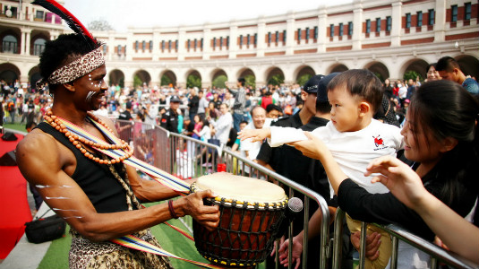民园广场上正在举办中外文化交流活动,外国演员在广场中心表演节目,与观众亲密互动。图中一个孩子正在演员引导下,尝试击打非洲托宁鼓。 作者/来源:和平区委网信办