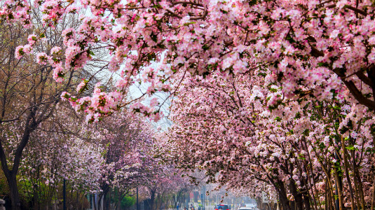 When spring comes, there are Malus spectabilis trees in blossom on both sides of Dali Road. Creator/Source: Heping District Cyberspace Administration