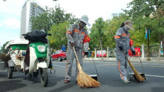 Sanitation workers of Heping district are cleaning the street ahead of the National Games. Creator/Source: Heping District Cyberspace Administration