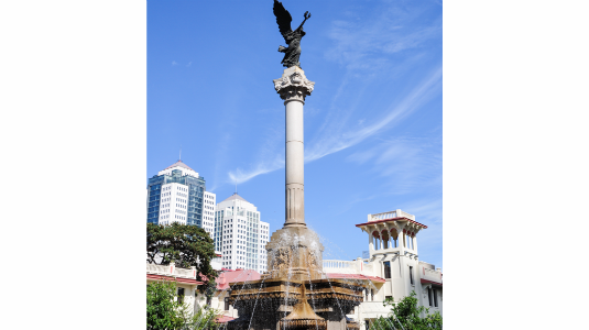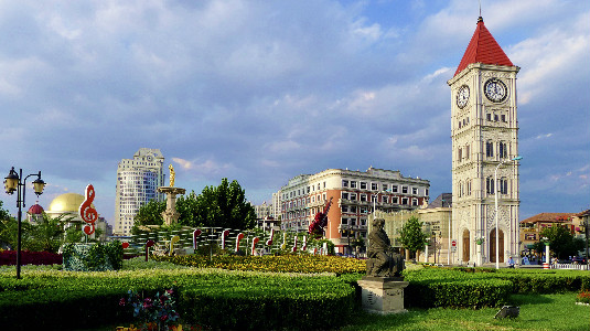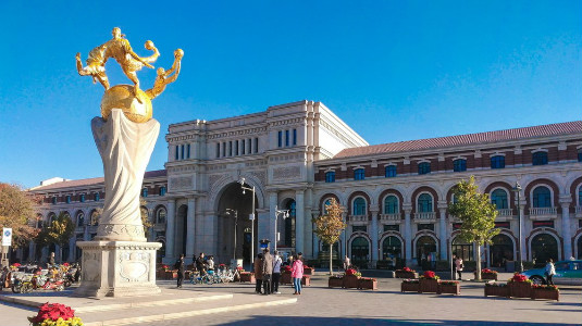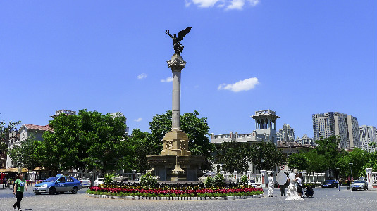 The Statue of the Goddess of Peace stands in the center of Marco Polo Square. It was constructed to mark the victory of World War I. Its main part consists of a fountain pool, a foundation support, a marble pillar and the goddess statue. The goddess holds an olive branch which represents "friendship and peace". Creator/Source: Hebei District Cyberspace Administration