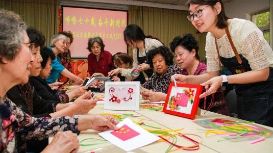 Fuming Community organizes Mother's Day activity. Volunteers are helping the aged to do handmade paper works. Creator/Source: Heping District Cyberspace Administration