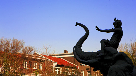A statue of a child riding an elephant whose trunk seems to stretch to the sky. Creator/Source: Heping District Cyberspace Administration