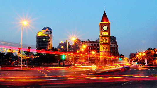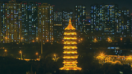 It is often night when a city's prosperity shows up the most. The landscape lights of the Zhiyuan Tower make itself bright, and the lights from the residential buildings behind it color the city. Creator/Source: Hebei District Cyberspace Administration