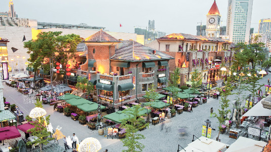 Landscape lights are lit up at the corner of the Italian-style Street. Together with the open air bars with red tiles and green umbrellas, all are in color waiting for the fall of night. Creator/Source: Hebei District Cyberspace Administration