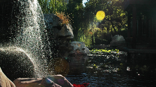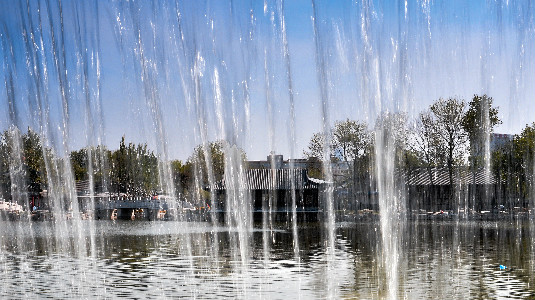 Looking at the pond and pavilions through the fountain water, Ningyuan Garden is like a hidden but beautiful spot. Creator/Source: Hebei District Cyberspace Administration